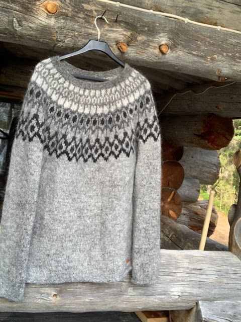 Vävymme halusi harmaan islantilaisneuleen ja lopulta hän valitsi upean Árni-neuleen mallin (tämä neulepaita toteutettiin pienin muutoksin). Neuloin sen islantilaisesta Léttlopi-langasta.
